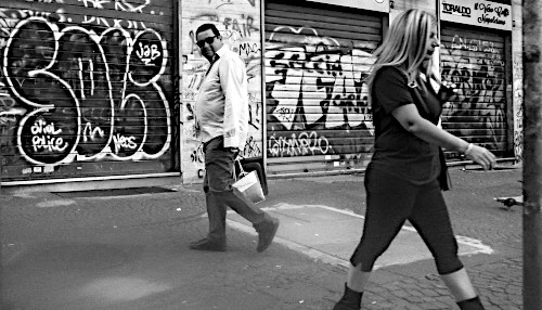 Personen laufen an Graffiti-übersäten Geschäften vorbei.